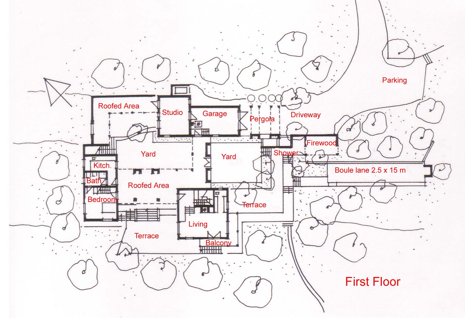 Η μεγάλη, σιδερένια κάγκελα μορφώνει την είσοδο. Μια εσωτερική οδό από μπετόν, τοποθετημένη με πλάκες Πηλίου οδηγεί σε συγκρότημα αυτό. Χώρος σταθμεύσεως και γυρίσματος είναι σε διάθεση. Μέσω της κατηφορικής τοποθεσίας το συγκρότημα είναι μαντρισμένη με φυσικές πέτρες και σοβατισμένους τοίχους. Πικροδάφνες, δενδρολίβανα, λεβάντα, γιασεμί, τριαντάφυλλα, και άλλα όμορφα άνθη διαμορφώνουν την εικόνα νότιου κήπου γύρω στο συγκρότημα. Ο χώρος μπόουλινγκ με μήκος 15 μέτρων προσκαλεί σε κοινωνικό παιχνίδι. Τα συνολικά άνθη ποτίζονται από αυτόματο σύστημα υδρεύσεως.