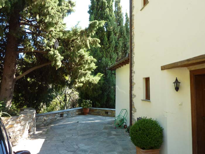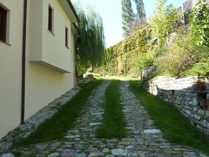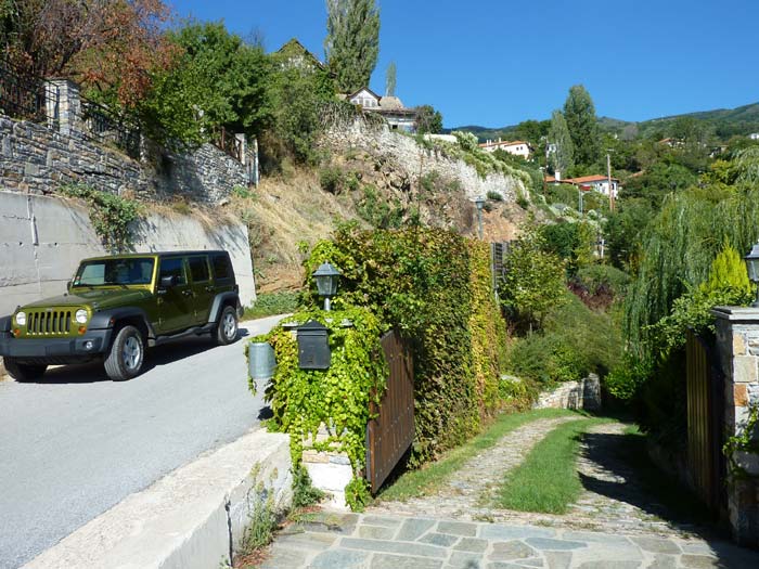 There is a big solid wooden gate at the entrance. Inside a concrete drive covered with stone slabs leads to the house. There is sufficient space to park and turn.